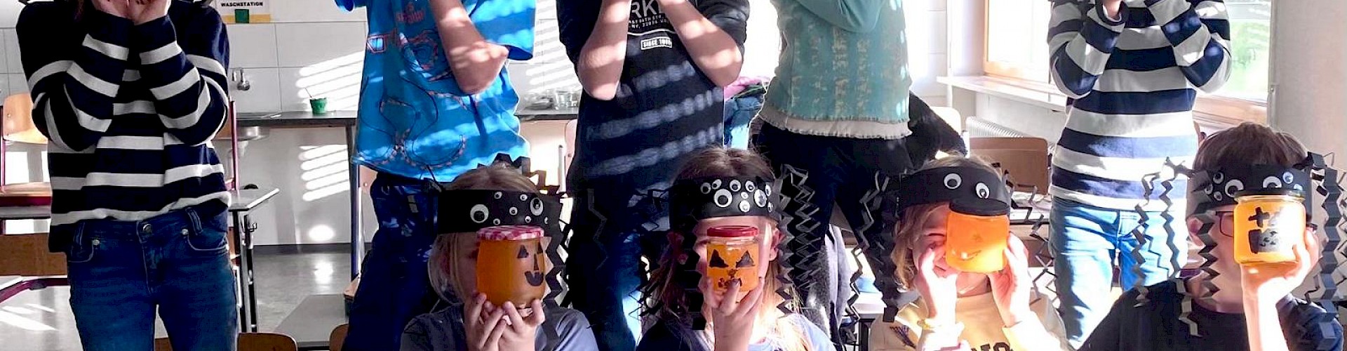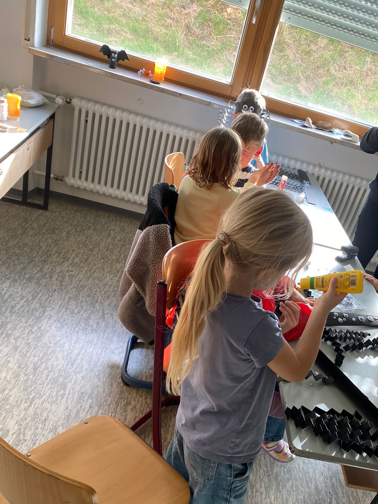 In der ersten Klasse wurde dieses Jahr das Basteln zu Halloween zu einem echten Erlebnis. Aus Marmeladengläsern bastelten die Kinder gruselige Mumien oder malten sie als Kürbisgesichter an. Auch Spinnen und Fledermäuse aus Klopapierrollen wurden fleißig gebastelt. Das absolute Highlight war der Spinnenhut. Stolz präsentierten die Kinder ihre Werke und trugen sie mit Begeisterung durch den Raum. Am Ende der Bastelaktion waren alle Kinder glücklich, ihre gruseligen Dekorationen sorgten für eine tolle Halloweenstimmung und jede Menge kreative Freude.