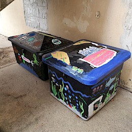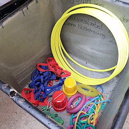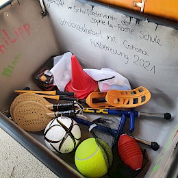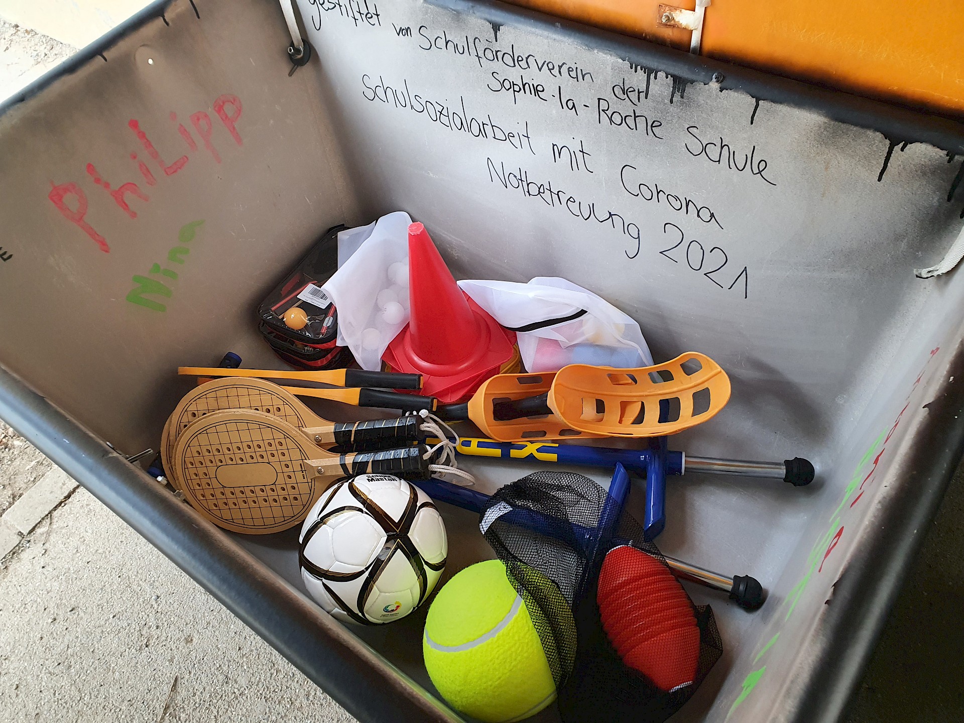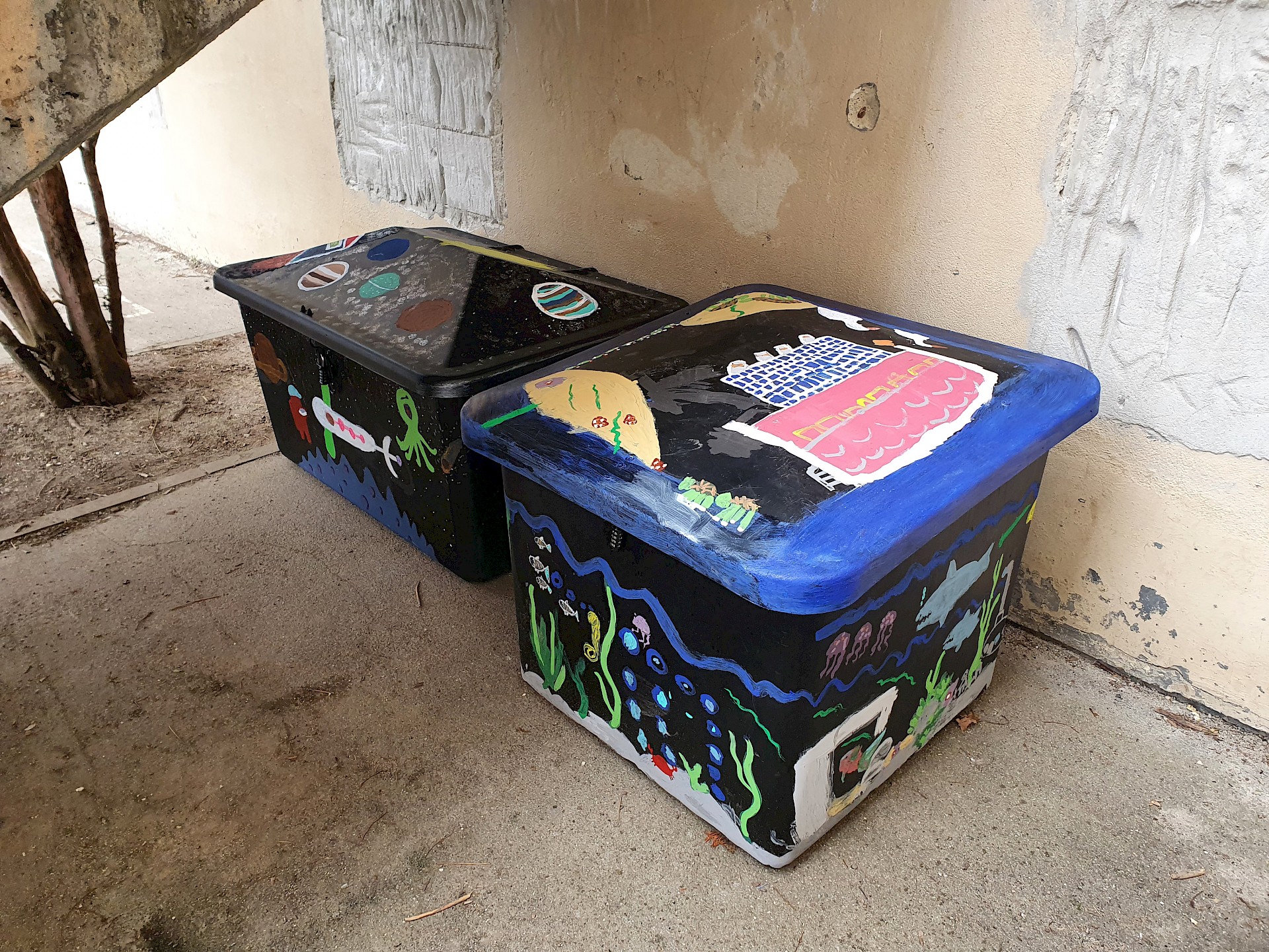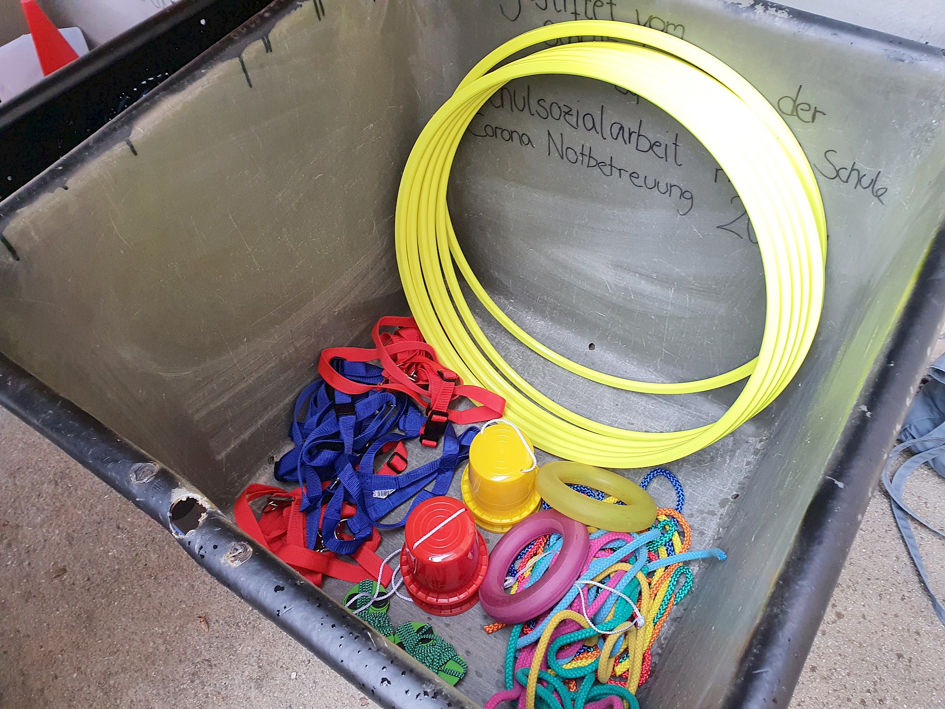 Bei diesem Gemeinschaftsprojekt des Schulfördervereins mit der Schulsozialarbeit gestalteten Kinder der Notbetreuung aus alten Streugutkisten kunstvolle Spielekisten im Weltraum- bzw. Unterwasserwelt-Design. Bestückt mit Spielgeräten für draußen kann nun in den Pausen an den Ausgabetagen gespielt, getobt und geturnt werden.